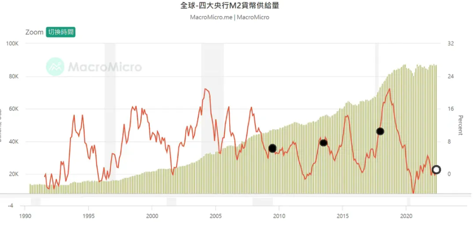 最初の3つの黒い点は過去3回の半減期を表しており、当時の世界4大中央銀行のマネーサプライ(M2)の年間成長率が現在よりもはるかに高かったことを示しています。前回の強気相場から現在に至るまで、4大中央銀行のマネーサプライ(M2)はほとんど増加していません。