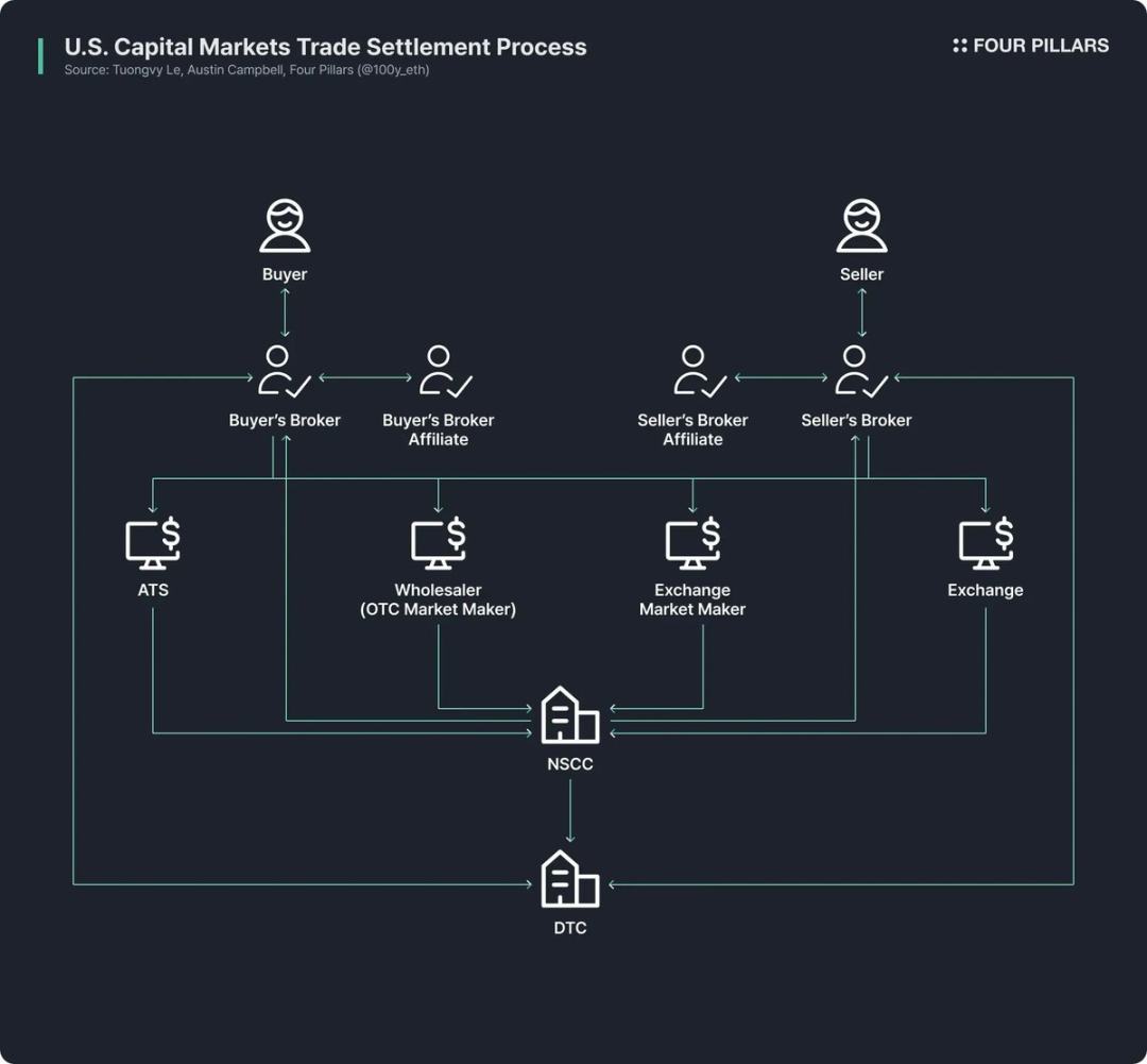 例えば、米国の株式・債券取引市場を例に挙げてみましょう。現在の構造は、1960年代後半の「ペーパーワーク危機」を受けて1970年代に行われた改革に端を発しています。証券投資者保護法(SEC)と証券法改正が成立し、預託信託会社(DTC)や全米証券決済機構(NSCC)といった機関が誕生しました。50年以上も運用されてきたこの複雑なシステムは、依然として仲介業者の重複、決済遅延、透明性の欠如、過剰な規制コストといった問題を抱えています。