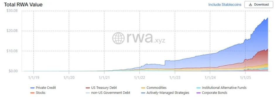 過熱にもかかわらず、RWA市場は急成長を遂げています。2025年8月23日時点で、発行済みRWAの総額は265億ドルに達し、前年比112%、2年前比253%、3年前比783%の増加となりました。トークン化された金融資産は多岐にわたり、米国債と民間信用が最も高い成長率を示し、次いでコモディティ、機関投資家向けファンド、株式が続いています。
