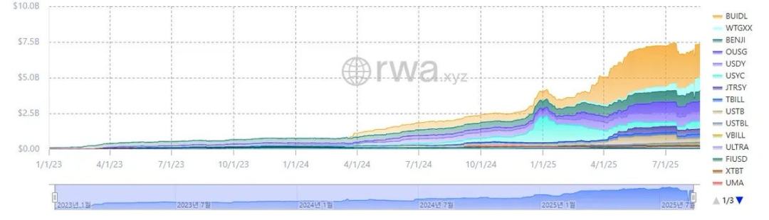 RWA市場において、米国債のトークン化が最も活発です。2025年8月23日時点で、米国債RWA市場規模は約74億米ドルとなり、前年比370%増と爆発的な成長を見せています。