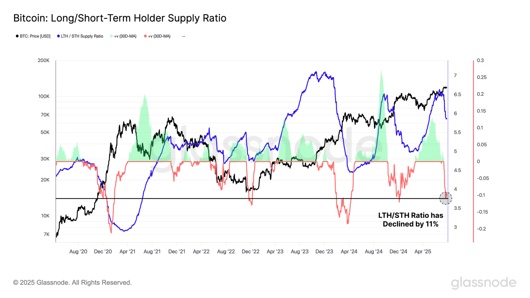 現在の流通フェーズが続く中、LTH/STH供給比率は縮小を続けています。過去30日間でこの比率は11%低下しましたが、取引日のうち8.6%のみがこれよりも劇的な減少を記録しており、投資家行動の変化の大きさを浮き彫りにしています。