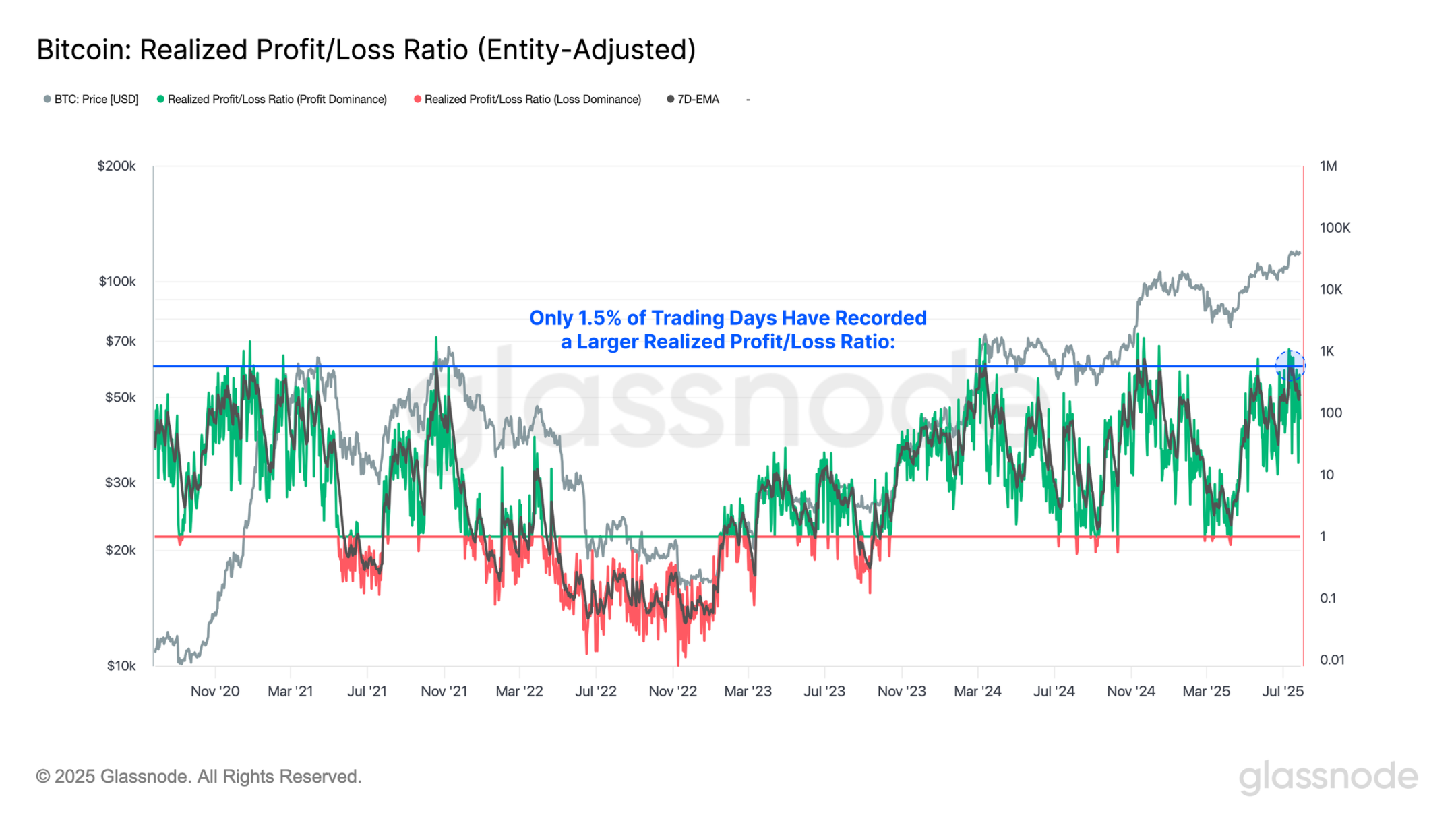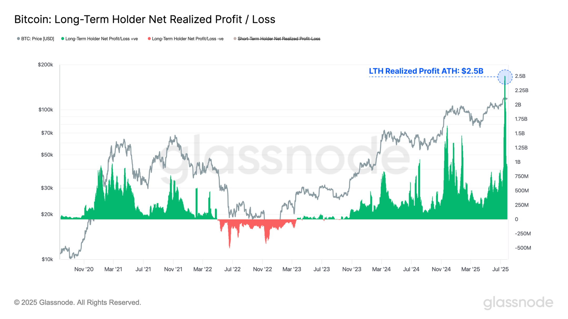 長期保有者の実現純損益(LH)は、長期間休眠状態にあった多数のトークンを消化した後、過去最高の25億ドルに達し、これまでのピークである16億ドルを上回りました。これはビットコイン史上最大の単発の売りであり、極度の流動性ストレステストとなりました。しかし、市場は驚くべき回復力を示し、価格は安定を維持し、過去最高値付近で推移しました。