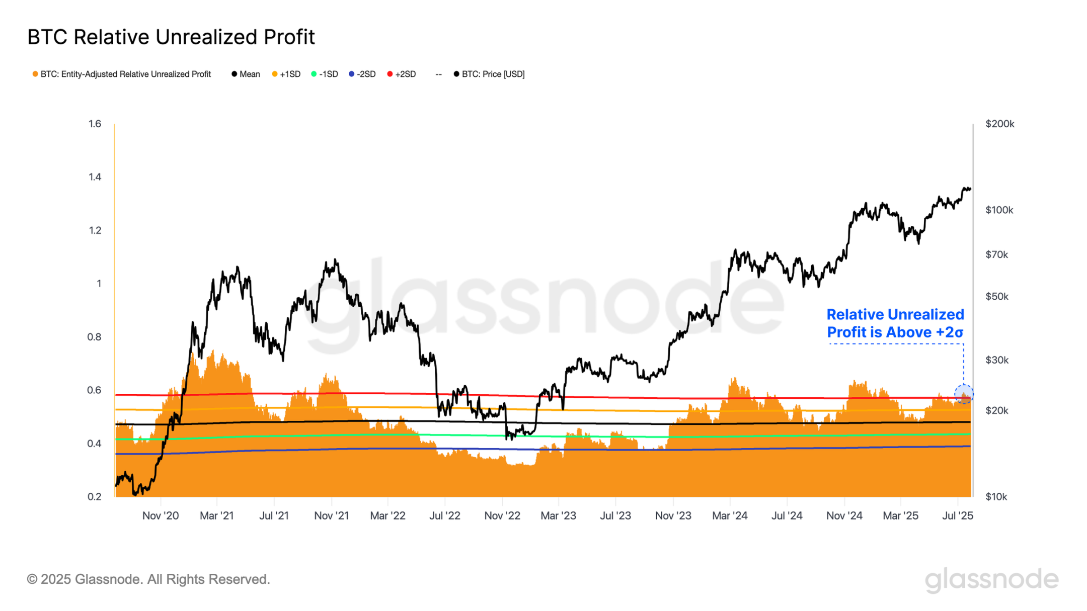 標準化された指標として、時価総額比率の未実現利益率も観察できます。現在、この指標は再び+2σレンジを突破しました。この水準は歴史的に市場の熱狂や天井形成と一致する水準です。標準化された観点から見ると、これは参加者が多額の未実現利益を保有しているという現実をさらに裏付けています。