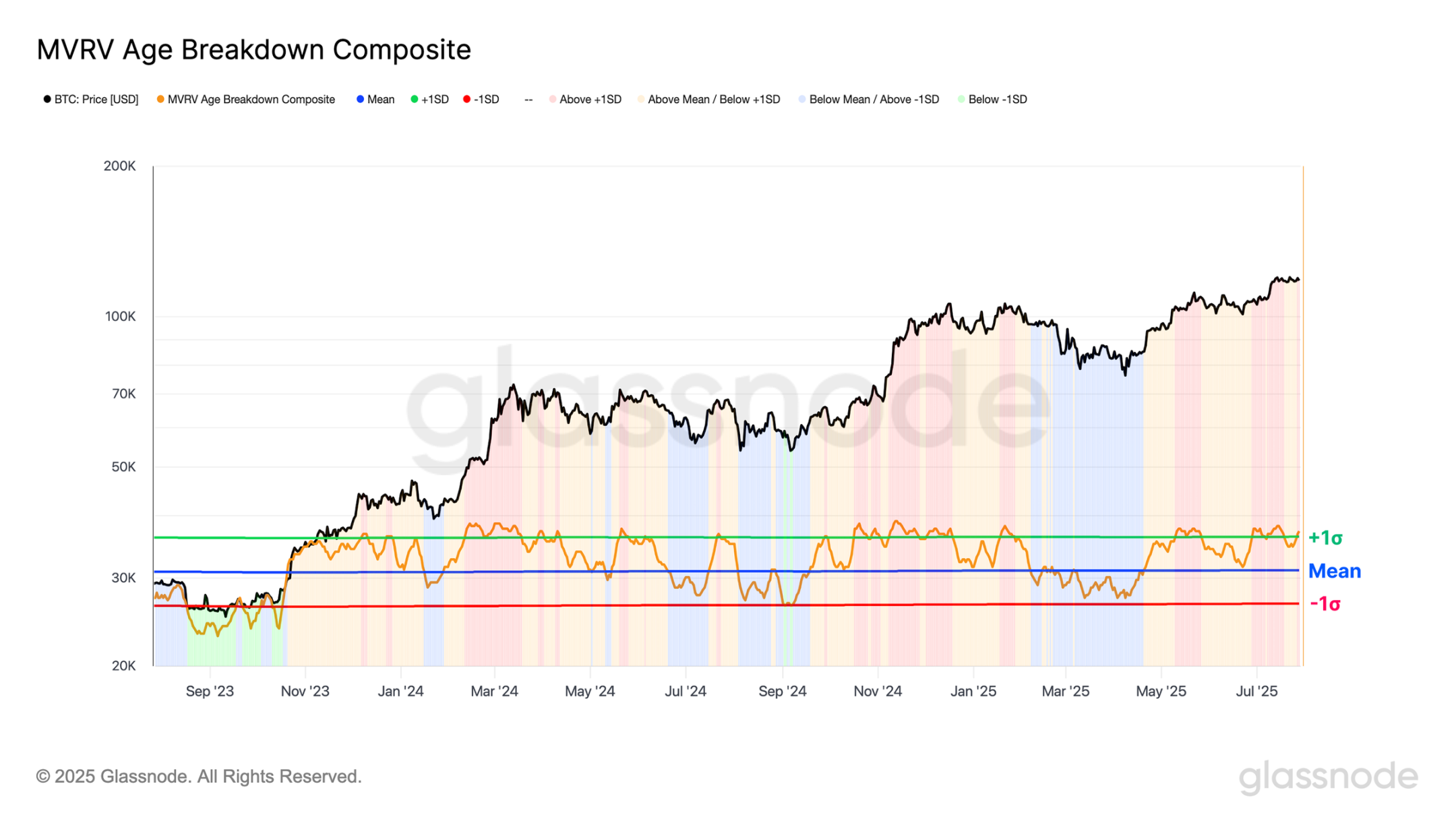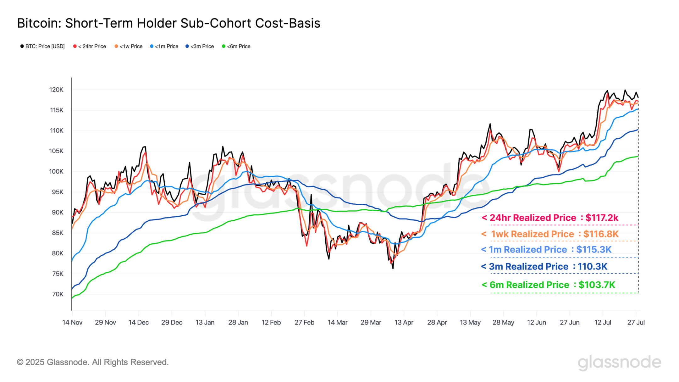 短期保有者のサブグループ内の原価ベースを分析することにより、短期市場センチメントのモメンタム指標として「高速および低速の原価ベースバンド」を構築しました。現在の価格はすべての短期保有者の原価ベースを上回っており、市場の堅調さを示しています。特に、24時間から3か月間の保有者の原価ベースバンド(11万ドルから11万7千ドル)は、原価ベース分布図の低出来高領域とほぼ重なっています。