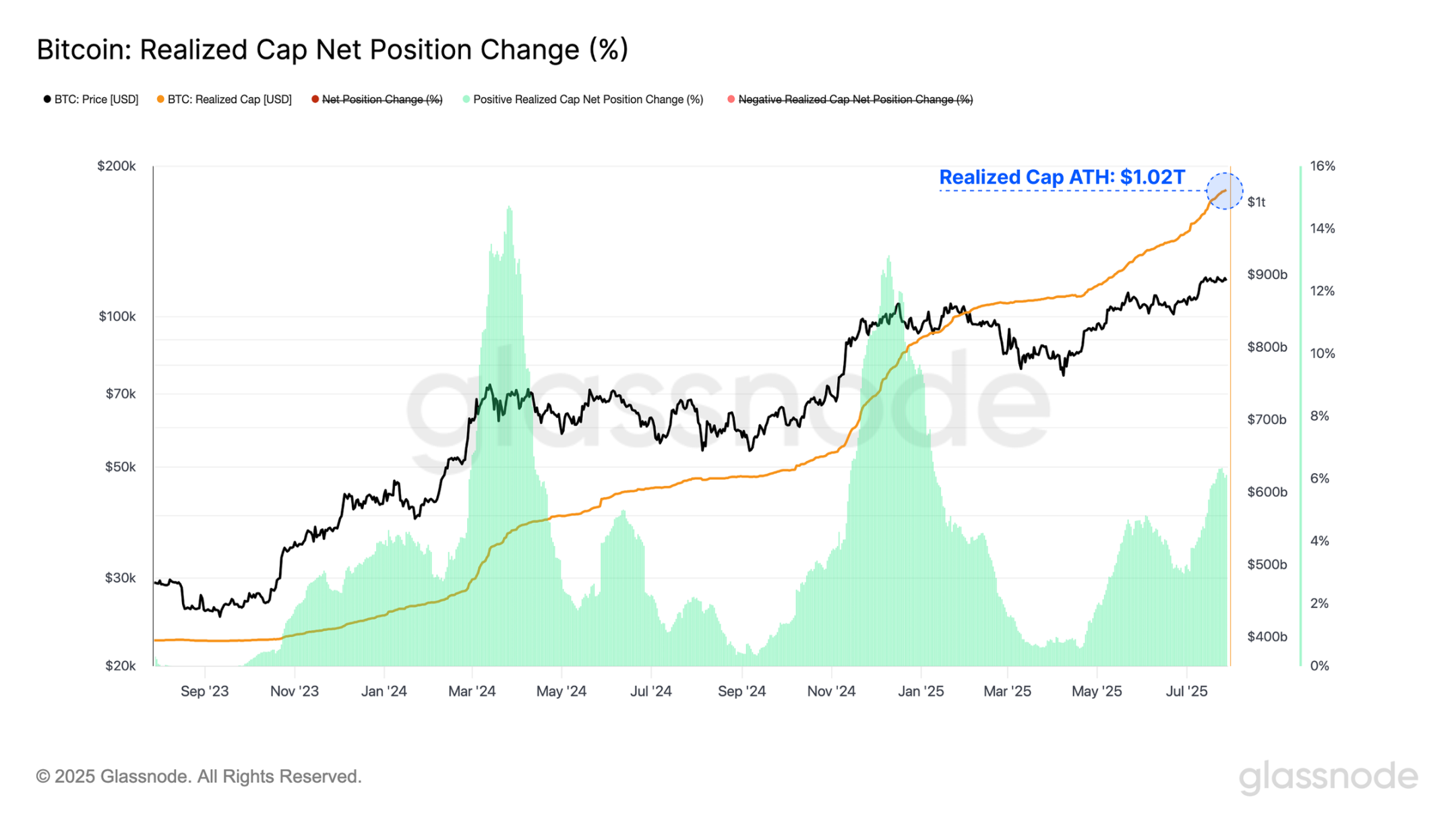 ビットコインネットワークにおける米ドル建て流動性の総量を定量化するのに使用される基本的なオンチェーン指標である実現上限は1兆200億ドルを超え、この資産の流動性の深さと市場の厚みが増していることを浮き彫りにしている。