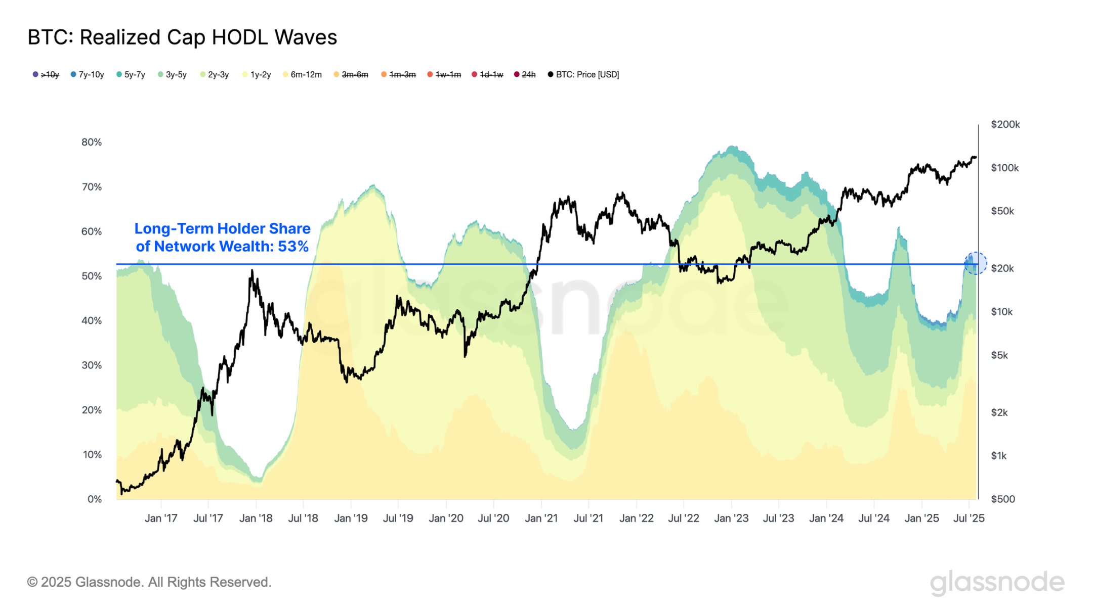 以前のサイクルとは異なり、長期保有者は依然として資産の53%を支配しています。このグループは今回のサイクルでも分配を続けてきましたが、未実現利益の水準が高いことを考えると、この割合は依然として大きなものです。