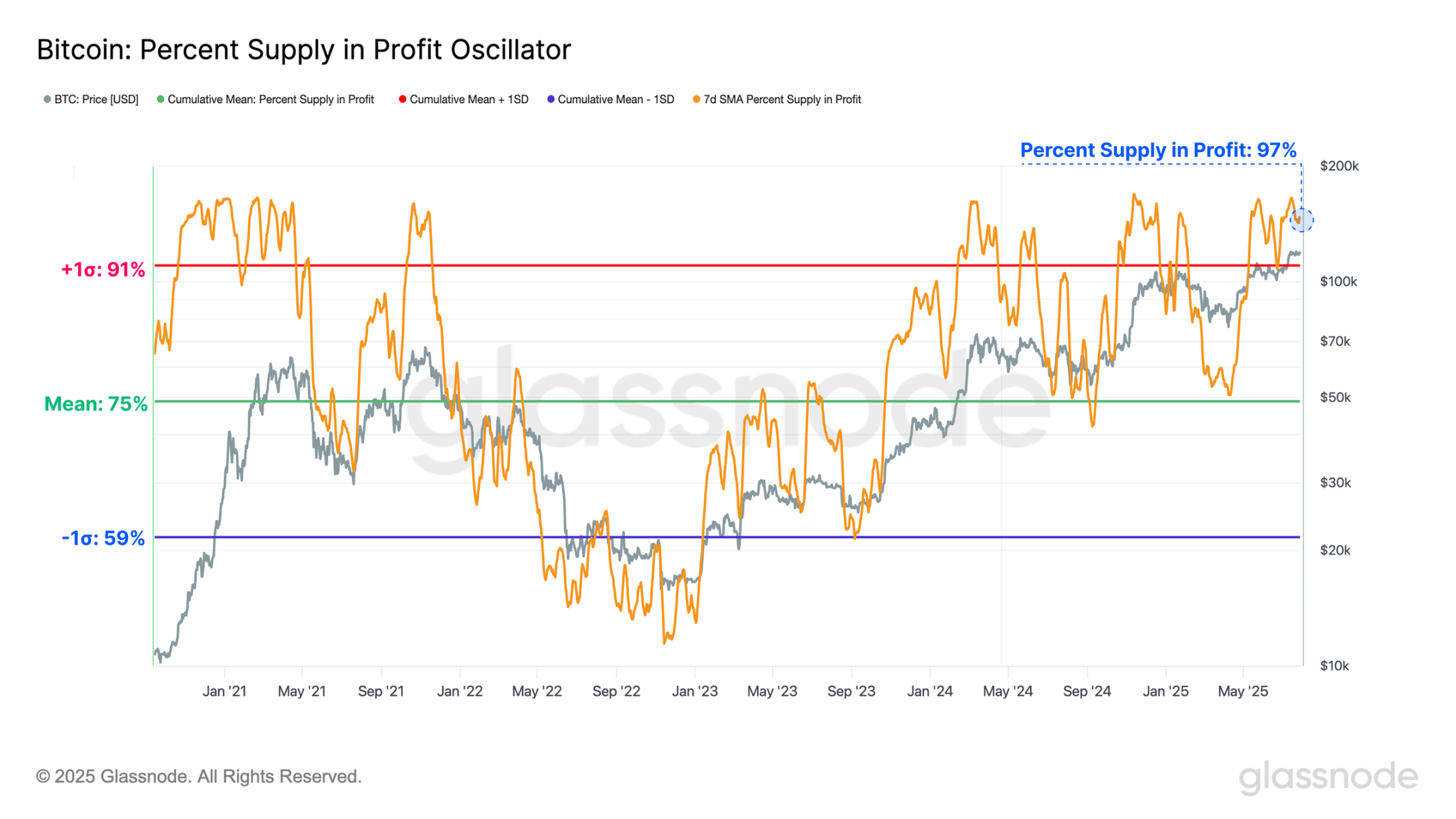週末にかけて、長期投資家による大幅な利益確定を含む大幅な売り圧力があったにもかかわらず、ビットコイン市場は驚くほど安定を維持しています。その結果、参加者の大多数は依然として多額の未実現利益を保有しており、流通供給量の97%が現在スポット価格を下回っています。