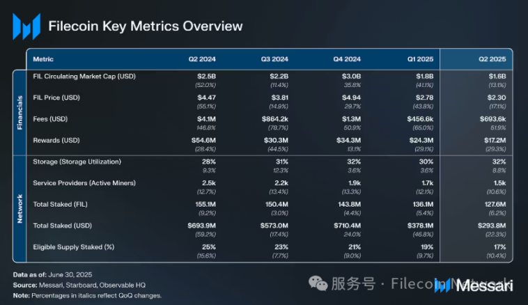 ステークされたFILの総量は、2025年第2四半期も引き続き着実に減少し、2024年第2四半期の1億5,510万FILから前四半期比6.2%減の1億2,760万FILとなりました。米ドル換算では、ステークされたトークン数の減少と四半期中の17.1%の価格下落の組み合わせにより、ステークの価値は22.3%減少して2億9,380万ドルとなりました。