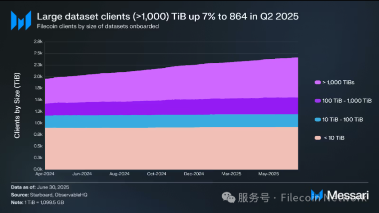 2025年第2四半期末までに、Filecoinは2,416件のオンボードデータセットをホストしました。これは、第1四半期の2,340件から3%増加したことになります。このうち、1,000TiBを超えるデータセットは864件で、前年同期の804件から7.5%増加しており、大容量の永続ストレージの市場における継続的な採用を浮き彫りにしています。この成長は、Filecoin Plusにおける継続的なデータオンボーディング活動、データセットのオンボーディングの障壁を下げる新たなエントリポイントとの統合の拡大、そしてエンタープライズおよび研究分野のワークロードの増加によって推進されました。