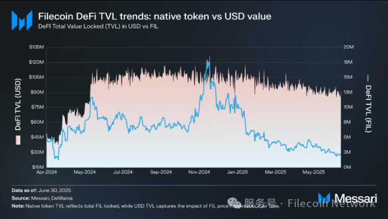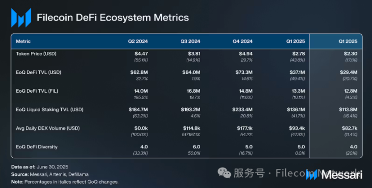USD建てDeFi指標は全面的に低下しました。これは主に、Filecoin(FIL)価格が前月比17.1%下落し、オンチェーンへの流入が限られていたことが要因です。これは、FVMエコシステムの継続的な成長にもかかわらず発生しており、最近の契約の展開はまだ初期段階にあり、十分な流動性を獲得できていないことを示唆しています。