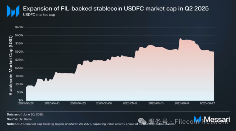 2025年第2四半期、USDFCの時価総額は3月末の93,000ドルから6月中旬には384,000ドルを超える高値まで上昇し、四半期末には301,000ドルで取引を終えました。この成長は、Filecoinネイティブのレンディングと取引の緩やかな成長と、ストレージプロバイダーとDeFi参加者がFilecoinを担保とし、米ドルにペッグされた資産に価値を保管することを好む傾向を反映しています。