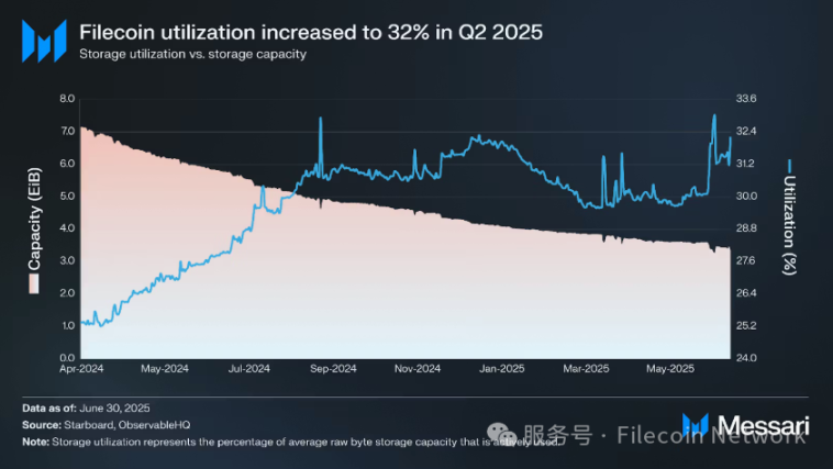 2025年第2四半期、Filecoinのストレージ利用率は第1四半期の30%から32%に上昇しました。コミットされたストレージ容量の合計は、前四半期比13%減少し、3.8エクサバイト(EiB)から3.3EiBとなりました。今四半期は新規のアクティブストレージ契約が追加されたにもかかわらず、既存契約(特に短期契約または無料契約)の満了により、アクティブストレージの総量は減少しました。この利用可能容量の減少と、高価値ワークロードからの安定した需要が相まって、利用容量の割合が増加し、ネットワーク利用率の上昇につながりました。