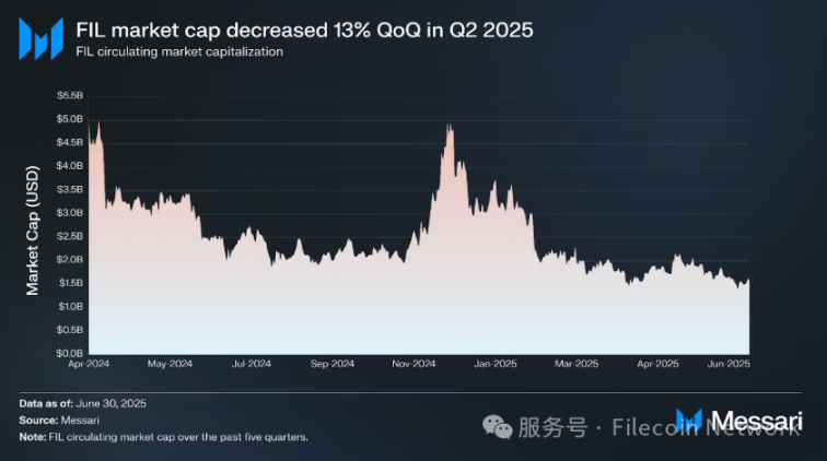 2025年第2四半期、Filecoinの流通時価総額(米ドル建て)は、前四半期比13.1%減少し、2025年第1四半期の18億ドルから16億ドルとなりました。この減少は、FILトークン価格が前四半期比17%下落(2.78ドルから2.30ドルへ)したことによるものです。一方、流通供給量は前四半期比4.9%増加し、6億7,770万FILとなり、前回の発行率とほぼ一致しています。