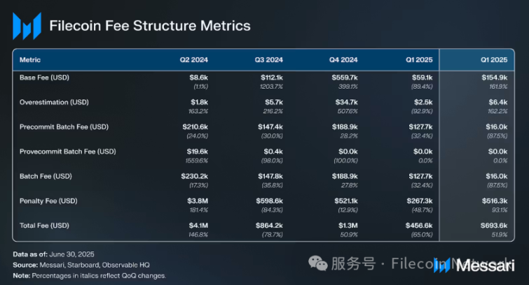 2025年第2四半期の手数料体系は、ネットワークが移行期にあることを示唆しています。基本手数料の増加は、オンチェーンアクティビティの増加(新規トランザクションの開始、FVMにおけるスマートコントラクトの利用、Filecoin Plusへのデータオンボーディングなど)を反映している一方で、バッチ手数料の大幅な低下は、ネットワーク戦略の転換、つまり高ボリューム、短期、または手数料無料のオンボーディングモデルから、より少数で高価値なトランザクションへと移行していることを反映しています。
