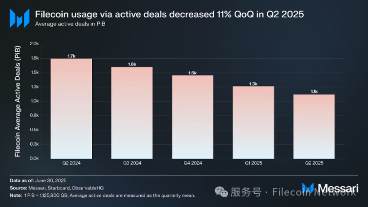 2025年第2四半期、Filecoinの1日平均新規ストレージトランザクションは2.8 PiBから3.4 PiBに増加し、前四半期比25%増となりました。一方、1日平均総実効ストレージは1,300 PiBから1,100 PiBに減少し、前四半期比11%減となりました。この差異は、新規トランザクションの流入量と全体の実効トランザクションストックの差を反映しており、大規模な契約(特に短期または手数料無料の取引)の満了により、新規トランザクションによって追加された容量よりも多くの容量が削減されたことが原因です。