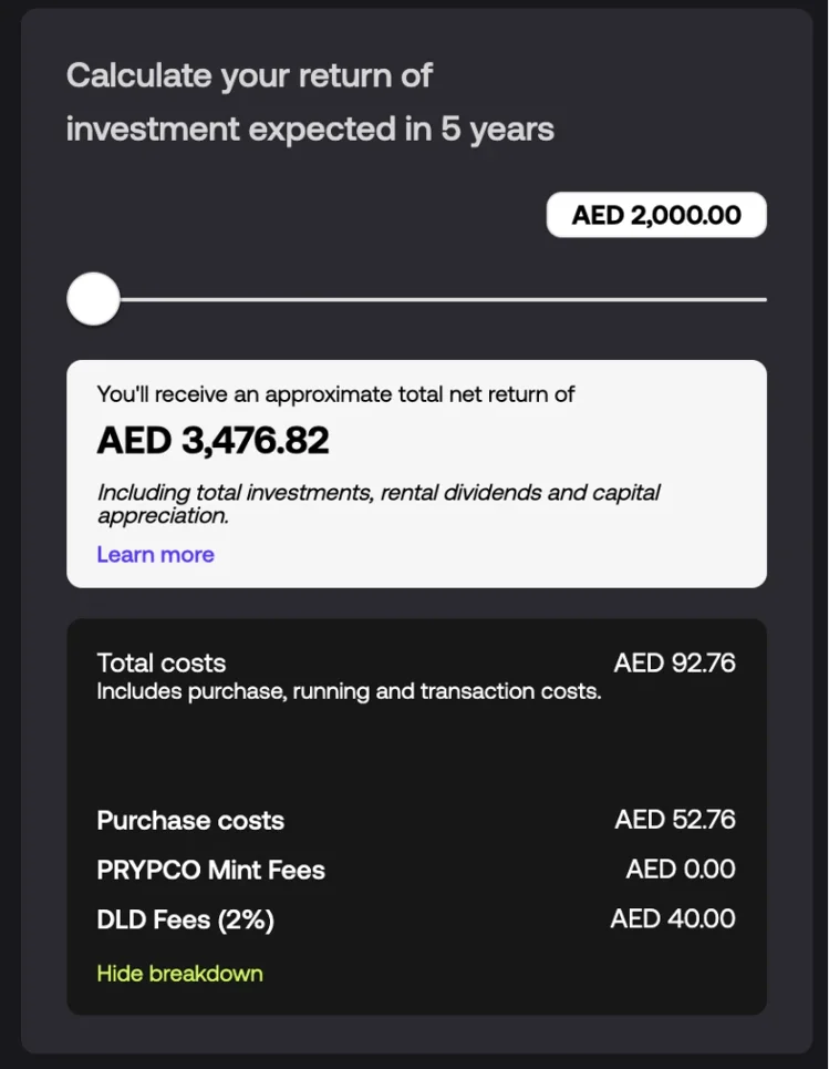 公式サイトによれば、投資家の最低投資額は2,000ディルハム(約4,000人民元)と低く、5年後の推定価値は約3,476.82ディルハム、5年間の総合収益率は73.84%となっている。なお、これは公式サイトから提供された推定値であり、実際の収益を示すものではないことに注意してください。