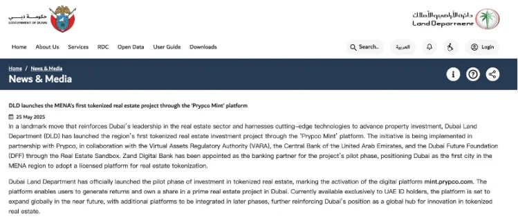 地球の反対側では、「トークン化されたアパート」が1日で完売した。 2025年5月26日、ドバイ土地局(DLD)は、不動産フィンテック企業Prypco、ブロックチェーンインフラプロバイダーCtrl Altと共同で、中東初の不動産トークン化プラットフォーム「Prypco Mint」を正式に立ち上げ、わずか1日でXRP Ledgerチェーン上の初の実世界資産(RWA)アパートメントの全額資金調達に成功しました。このプラットフォームは、2033年までにドバイの不動産市場における取引の約7%をブロックチェーン上に載せることを目指すUAE政府のブロックチェーン戦略の重要な部分を担っている。その時点で、総資産は160億米ドルに達すると予想されている。
