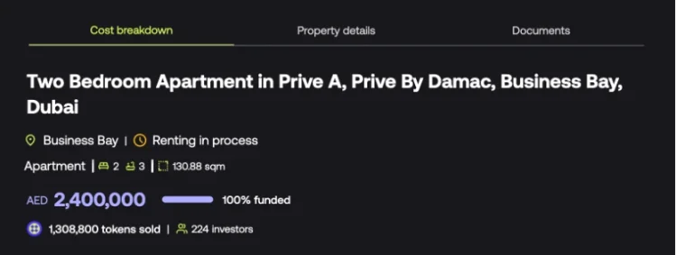 資金調達を完了したこの不動産トークン化プロジェクトは、ドバイの中心エリアであるビジネスベイに位置しています。これは、有名な開発業者 Damac が建設した住宅複合施設 Prive by Damac 内の 2 ベッドルーム ユニットです。建築面積は約130.88平方メートルで、ベッドルームが2つ、バスルームが3つあります。このプロジェクトは湖の完全な景色を特徴とし、ホテルスタイルのサービス施設を備えています。