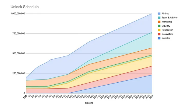 財団は 12% (1 億 2,000 万 TGE) を占め、そのうち 1% が TGE でリリースされています。エコシステムとインセンティブは 11.1% (1 億 1,100 万 TGE) を占め、そのうち 5.65% が TGE でリリースされています (3.5% のロックされたエアドロップ報酬と 2.15% の遡及的インセンティブを含む)。マーケティングは 8.9% (8,900 万 TGE) を占め、そのうち 7.7% が TGE でリリースされています。流動性とマーケット メイキングは 2% (2,000 万 TGE) を占め、そのうち 2% が TGE でリリースされています。