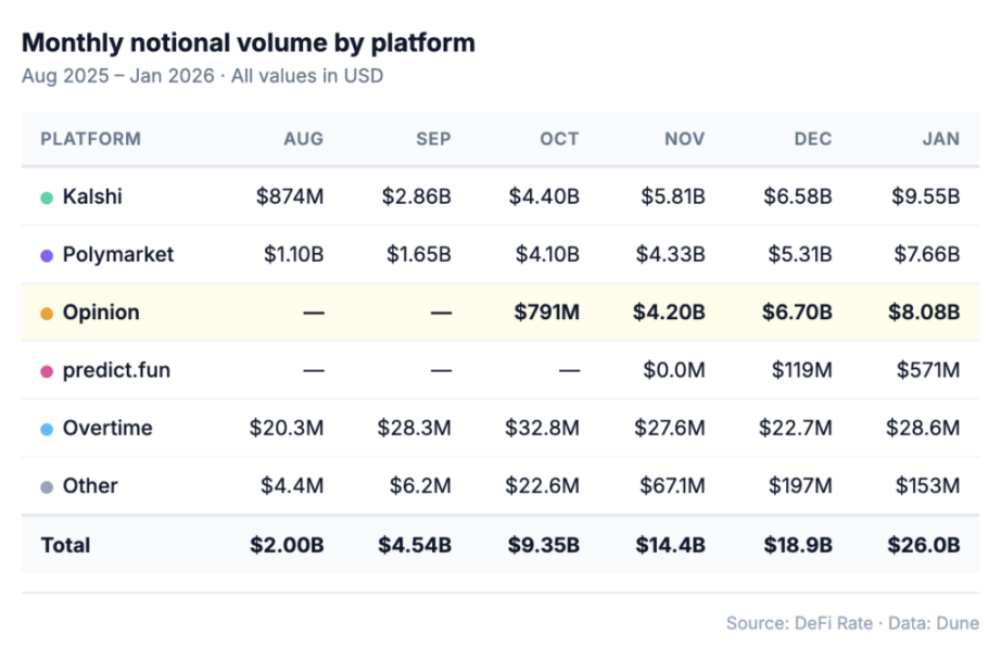 Opinionは10月23日にローンチされ、最初の1ヶ月(1ヶ月未満)で7億9,100万ドルの取引高を達成しました。11月には42億ドル、12月には67億ドルに達し、同月のKalshiとPolymarketの取引高を上回りました。