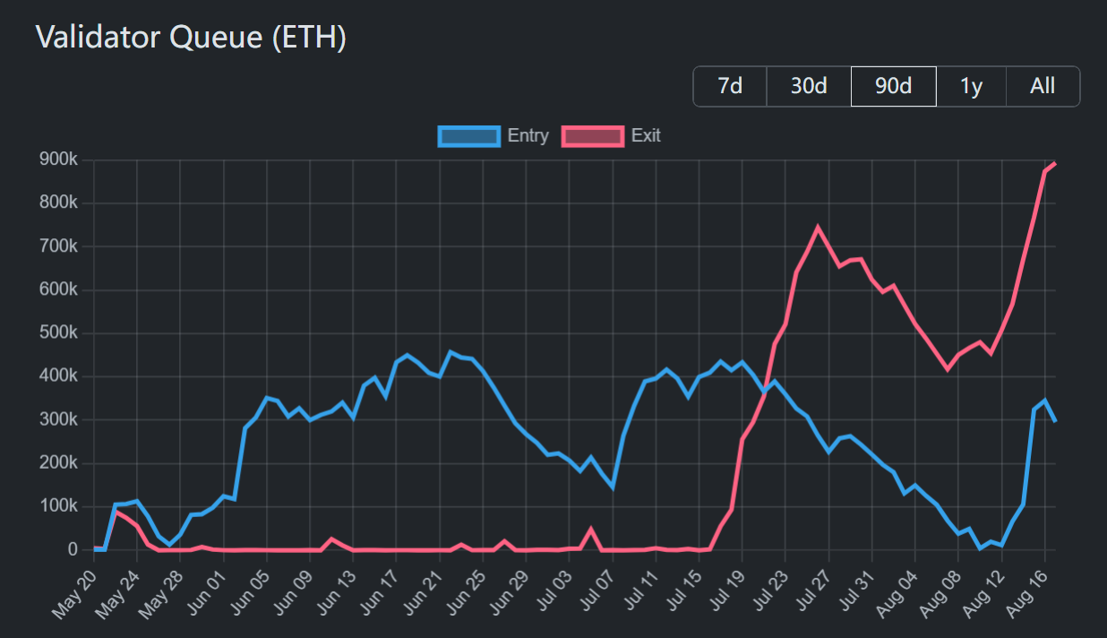 8月中旬時点で、イーサリアムビーコンチェーンのバリデーターの出口キューは過去最高を記録しました。ステーキング解除を待っているETHは約31億ドル相当でしたが、ステーキング待ちのETHは約4億8000万ドルにとどまりました。この資本フローの大きな不均衡は、大きな売り圧力を生み出す可能性がありました。