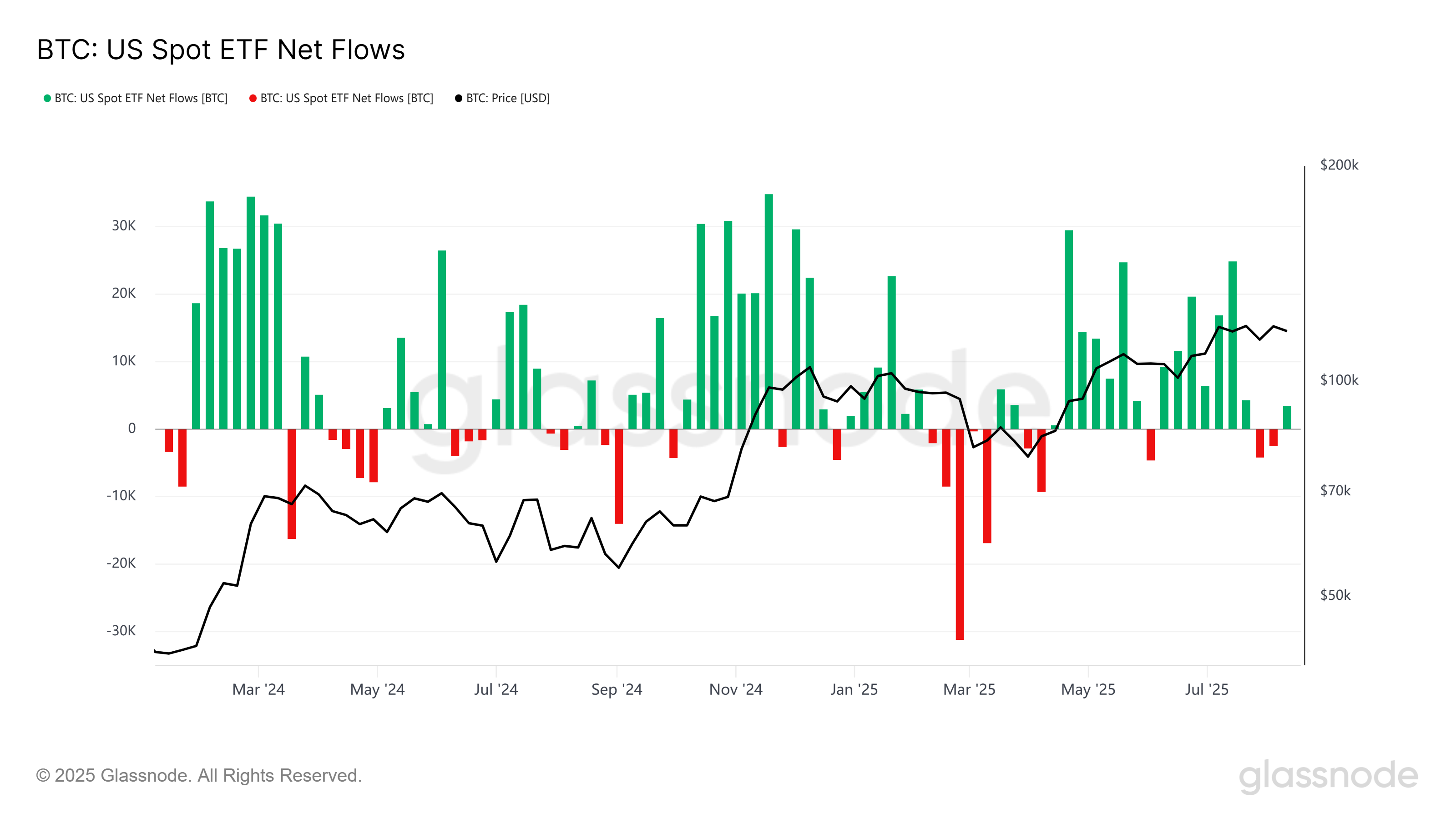 まず、ETFへの流入額を正確に把握する必要があります。市場センチメントが好調であるにもかかわらず、Glassnodeのデータによると、8月の米国スポットビットコインETFへの週次純流入額は数億ドルと堅調に推移しました。ウォール街からの機関投資家によるこの買いは現実のものであり、持続的なものですが、同時に、同程度の大幅な売り圧力に直面しています。