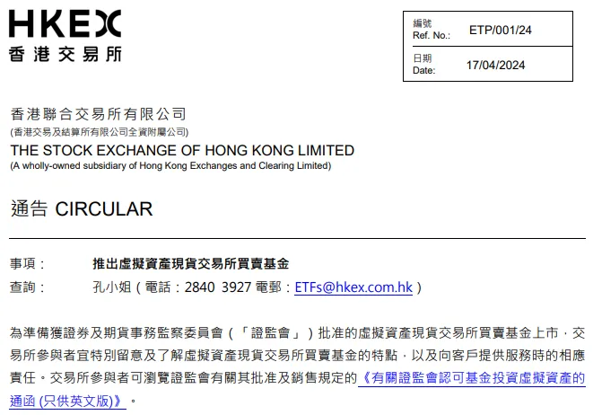 実際、香港証券取引所は 4 月 17 日の時点で、次のような「仮想資産現物取引ファンドの開始」という通知を発行していました。