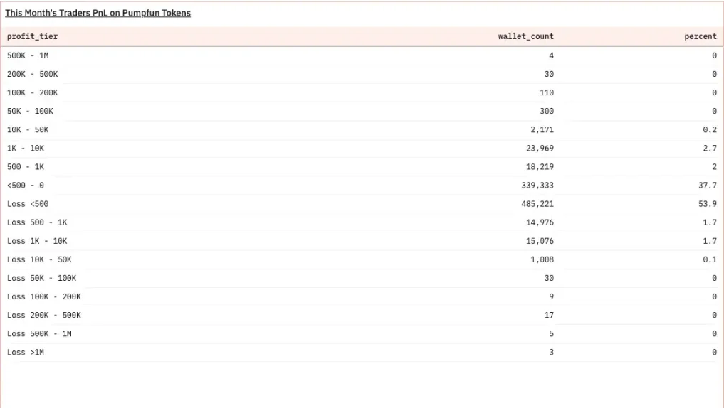 PumpFunに参加するプレイヤーの損益比率は、以前は7:3から6:4の間で変動していましたが、現在は6:4に達しています。しかし、損益の幅はほぼ±500ドルの範囲に集中しており、ミームコインの富裕効果は消滅しつつあります。出典:DUNE