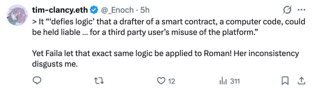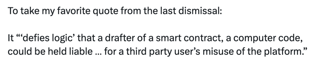 ブライアン・ニスラー氏はツイートで、以前の判決の一文を引用し、スマートコントラクトの起草者が第三者ユーザーによるプラットフォームの悪用に対して責任を負うのは「非論理的」であると述べた。