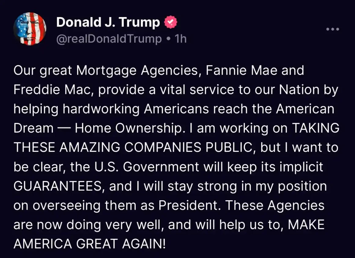 FHFAがファニー・メイとフレディ・マックに対し、住宅ローン評価システムにビットコインなどの仮想通貨を組み込むよう要請するわずか1か月前、トランプ米大統領は自身のソーシャルメディア「Truth」で、「私はこれらの偉大な企業(フレディ・マックとファニー・メイ)を株式公開する作業を進めているが、米国政府が暗黙の保証を維持し続けること、そして私が大統領として揺るぎなくこれらを規制していくことを明確にしたい」と述べた。