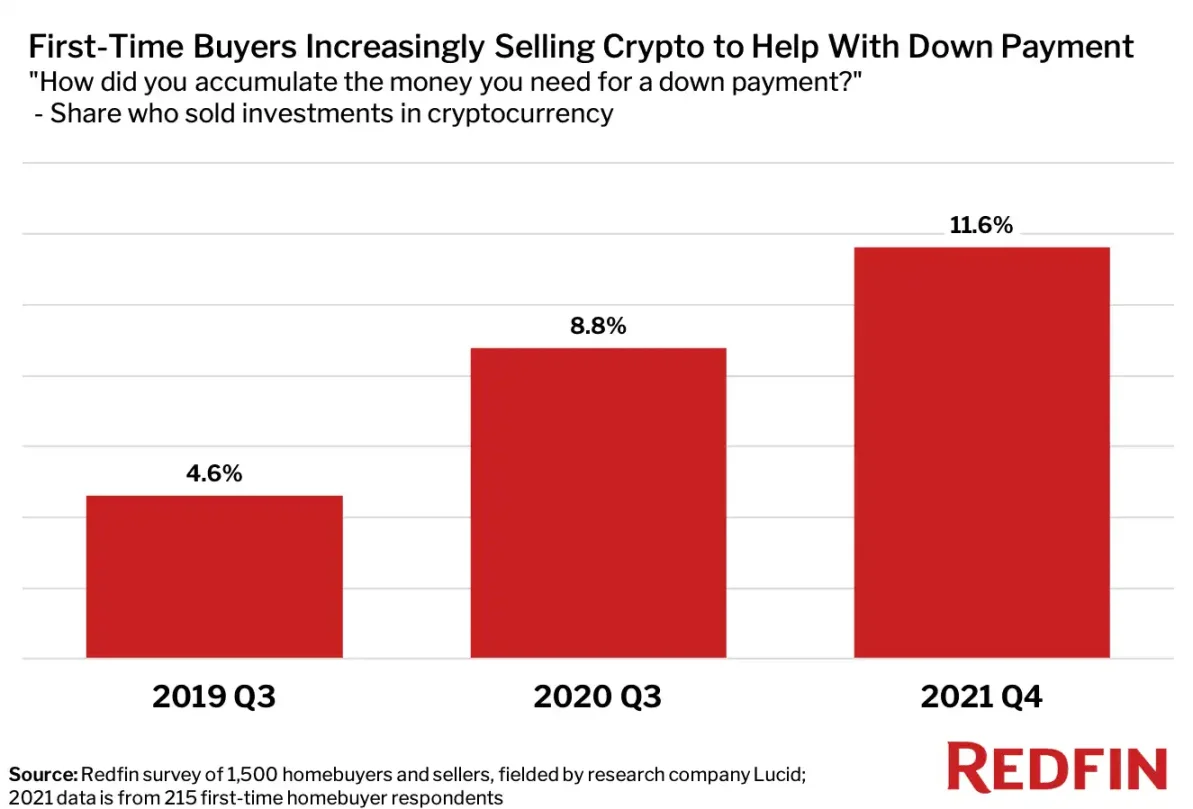 RedFinは2021年にポピュラーサイエンス調査を実施しました。調査テクノロジー企業Lucidに委託し、初めて住宅を購入する人1,500人を無作為に抽出しました。「頭金はどのように貯めましたか?」という質問に対する回答で最も多かったのは「給与から」(52%)で、次いで「家族からの現金援助」(12%)と「退職金から前払いで資金を引き出す」(10%)でした。注目すべきは、「仮想通貨を売却して住宅を購入した」という回答が2019年から2021年にかけて徐々に増加し、2021年末には約12%に達したことです。4年後、仮想通貨の普及に伴い、この割合はさらに増加している可能性があります。