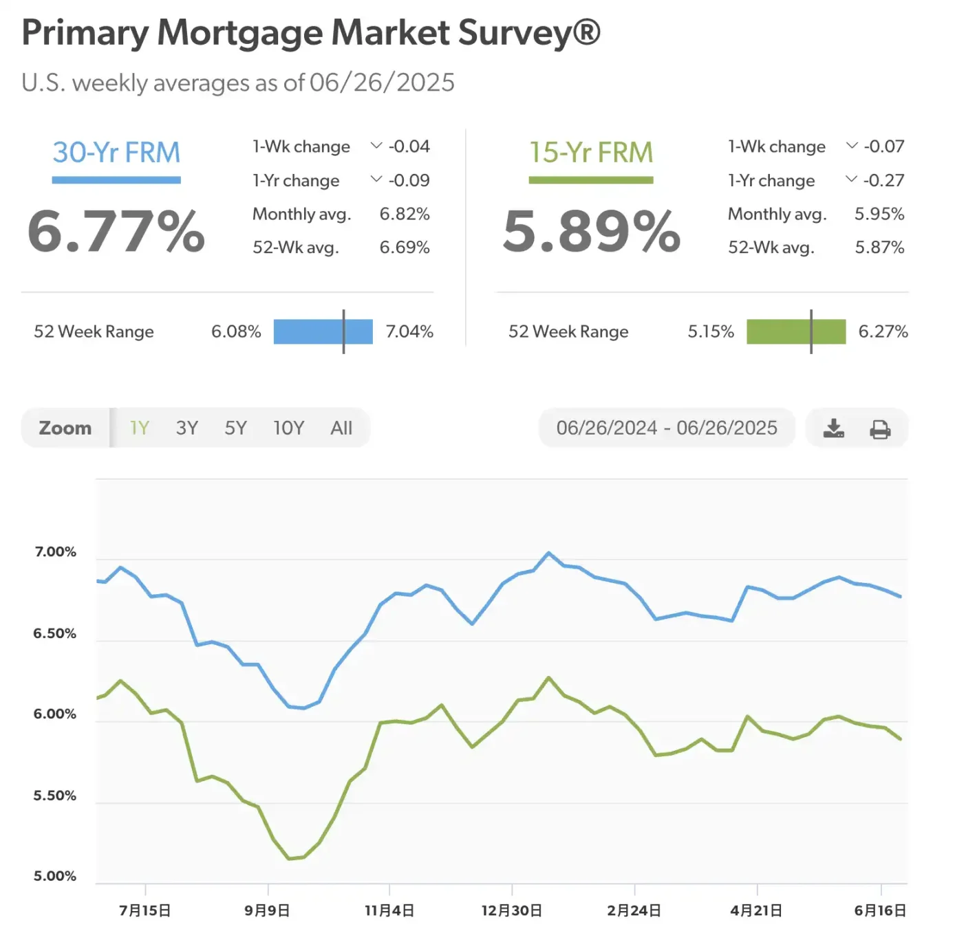 フレディマックのデータによれば、米国の30年住宅ローンの現在の年利は一般的に7%前後で変動しているが、15年住宅ローンの年利は6%前後で変動している。