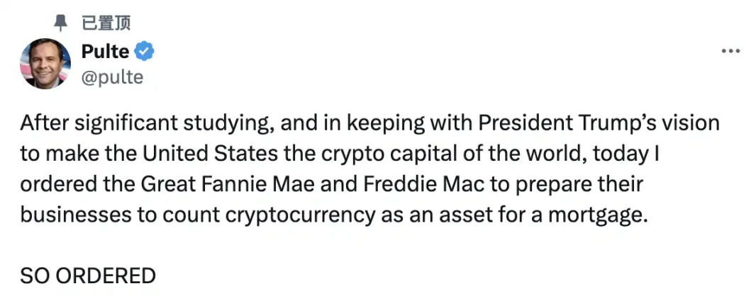 ウォール街の百年の歴史を持つ証券会社から連邦住宅金融規制当局、トランプ大統領の公式発言から不動産業界の資本構造の再編に至るまで、ビットコインを基盤とした金融秩序は上から下まで浸透しつつある。ビットコインのアイデンティティは「デジタルキャッシュ」から「電子ゴールド」へと進化し、今や「信用媒体」となり、伝統的な金融に新たな資本構成方法を提供しようとしている。そして、この「分散型資産+連邦信用ツール」というアーキテクチャは、住宅ローンの最も深層的な設計ロジックに影響を与えている。