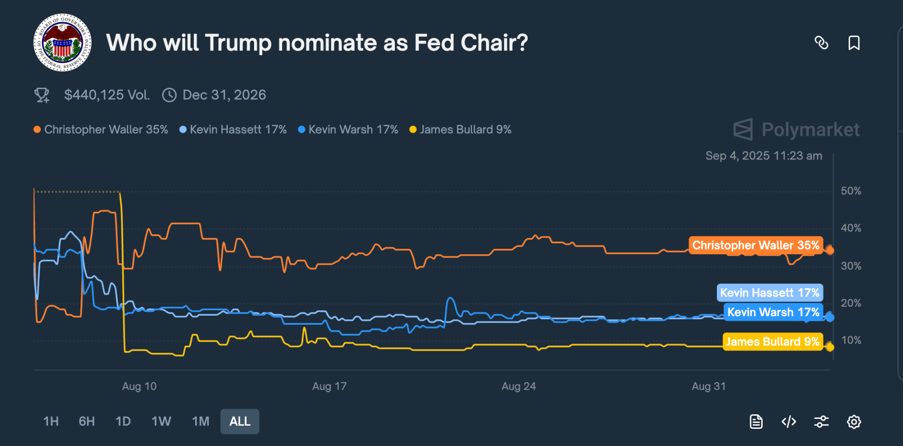 8月7日、予測市場「Kalshi」において、連邦準備制度理事会(FRB)理事のクリストファー・ウォーラー氏の当選確率が前日の16%から50%を超え、初めて全ての候補者を上回りました。その後、オッズは変動していますが、ウォーラー氏は依然としてトップを維持しています。