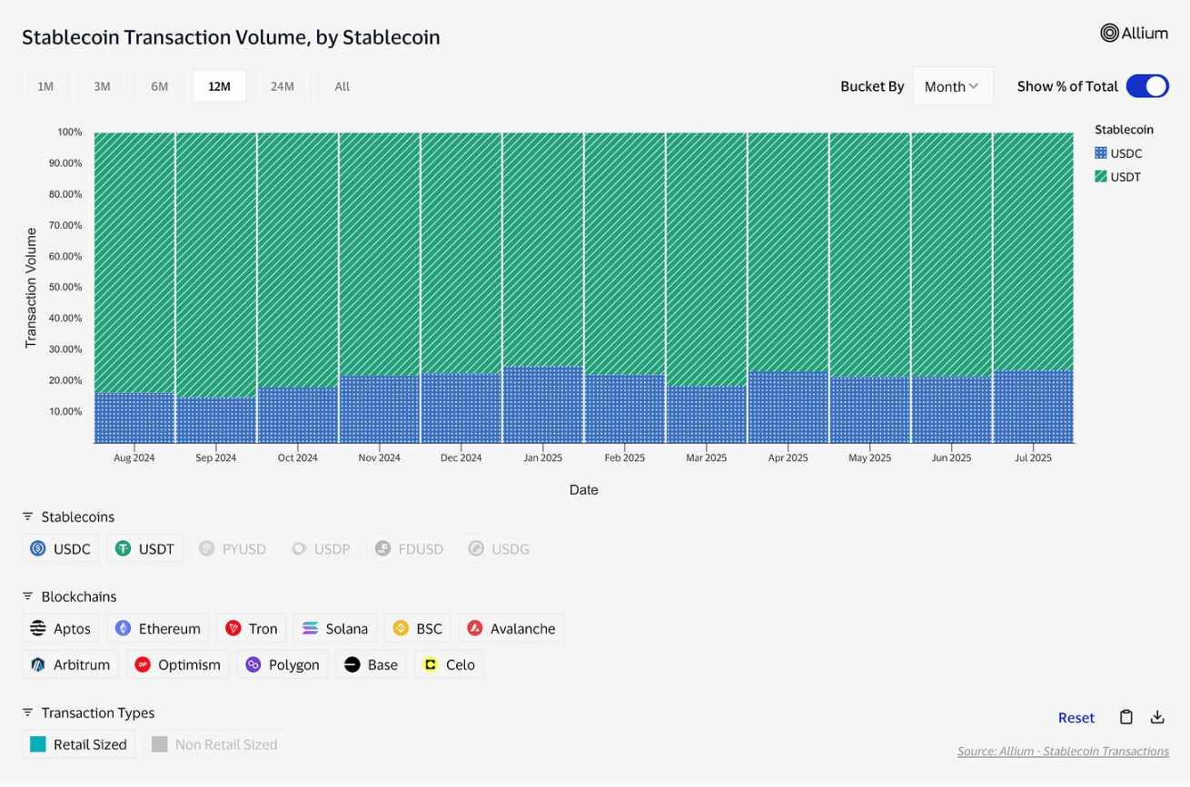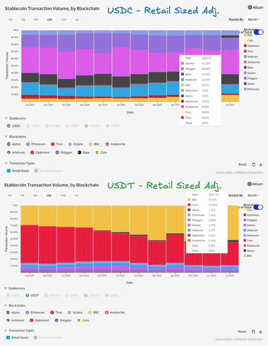 小売では、手数料が低くスループットが高いチェーンが有利です。USDT と USDC の両方の小売取引量は、スループットが高いチェーンで発生するのが一般的です。