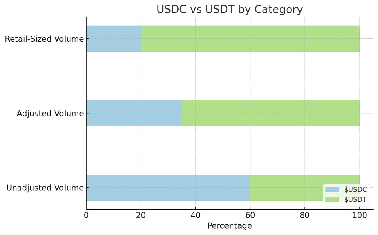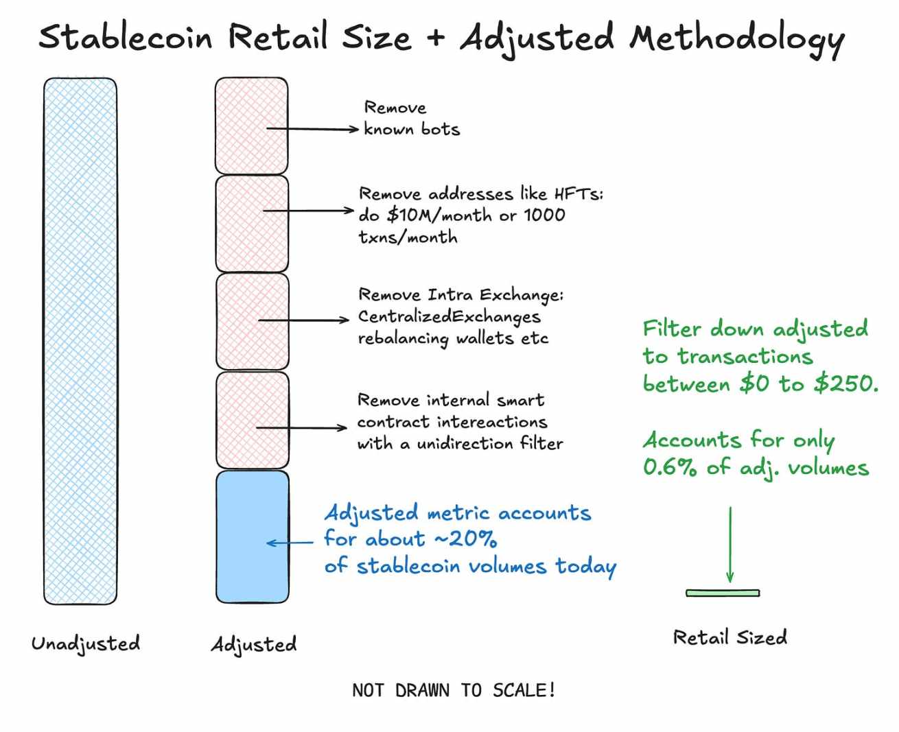 「小売サイズ」のターコイズ色は、調整後のステーブルコイン取引量のわずか0.6%を占めるため、データパネルではほとんど見えません。