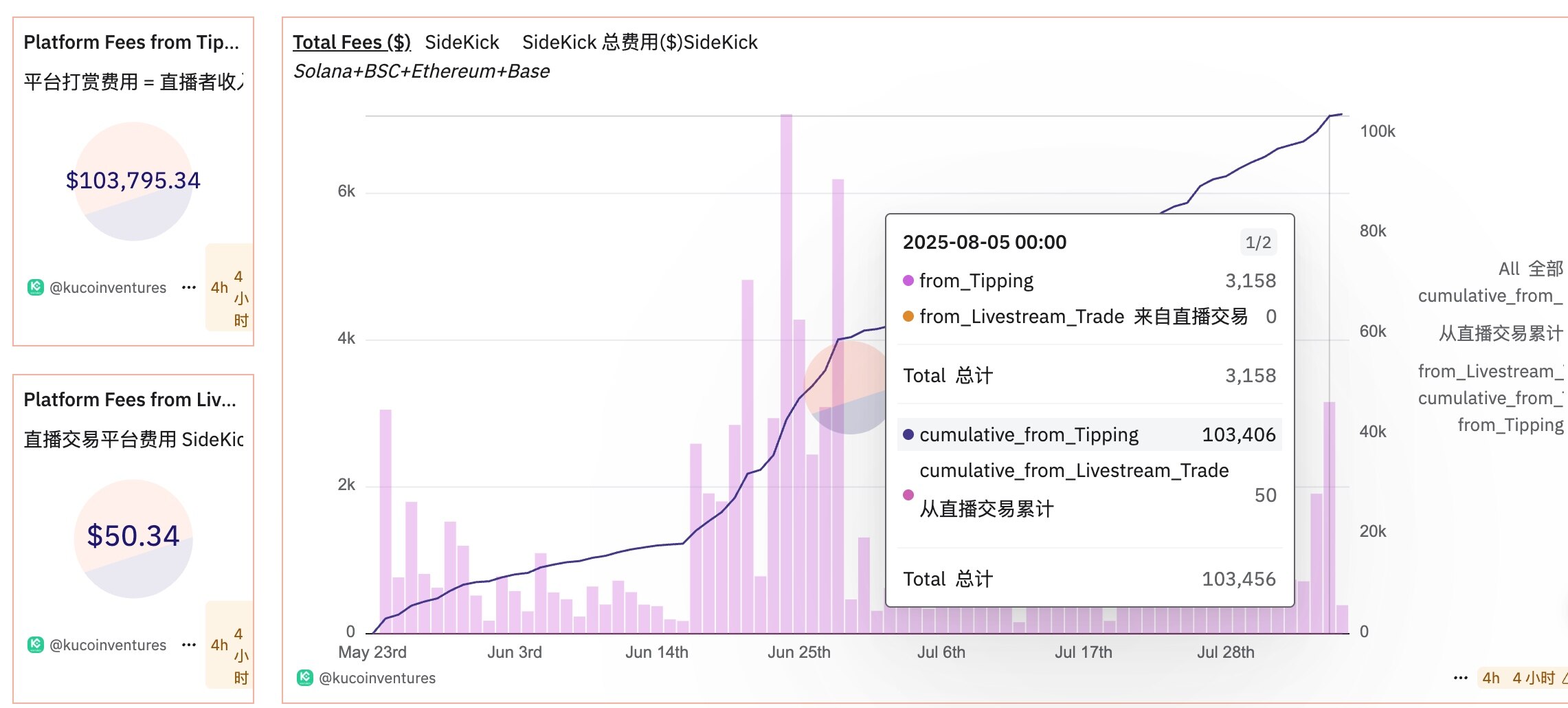 8月6日時点で、Sidekickプラットフォーム上のライブ放送報酬料金(ライブ放送者の収入)はわずか103,700米ドルでした。8月5日には、Sidekickプラットフォーム上のライブ放送報酬料金は約3,100米ドルに過ぎませんでした。