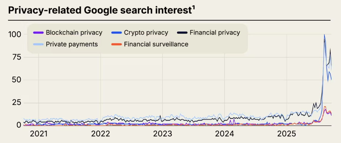 Zcashの急騰は、暗号資産文化における変化を反映しているようだ。a16zの「2025年暗号資産の現状レポート」が指摘しているように、最近、プライバシー関連の用語のGoogle検索が急増している。