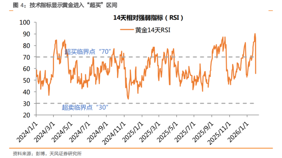 3. 根本原因:投機筋のポジション過剰と利益確定。華泰証券は、暴落前、非鉄金属(特に銀)が世界的にロングポジションが最も集中していたと指摘した。天豊証券のデータによると、金の14日間RSIは1月28日に今世紀初頭に90を突破し、極端な「買われ過ぎ」状態を示している。
