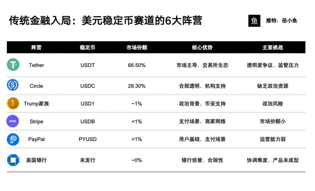 米国ステーブルコイン法(GENIUS)の施行により、従来型金融の市場参入が加速し、6つの主要な勢力が形成されました。