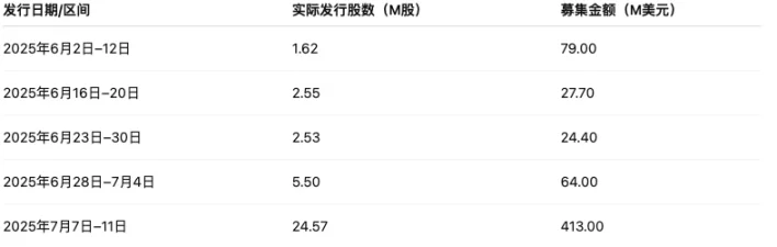 わずか4億2500万ドルの資金調達では、シャープリンクがETHをさらに購入するための資金が不足しているため、同社はATM時価株式発行方式を採用して資金調達を行いました。ATMとは、上場企業が株式を時価で直接二次公開市場に売却する資金調達方法を指します。ATMは一度に完了するのではなく、目標ポジションに達するまで継続的に売却されます。シャープリンクの総額60億ドルの株式発行の大部分は、この方法で完了する可能性があります。同社が開示したSECの文書および発表によると、7月11日時点で、シャープリンクはATMを通じて6億810万ドルを調達しました。