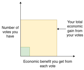 投票システム(ソーシャルメディアプラットフォームにおける「いいね!」やリポストなど)を想像してみてください。ユーザーAがユーザーBの10倍のリソースを持っている場合、彼の投票力もBの10倍になります。しかし経済的な観点から見ると、投票力1単位あたりのAの利益はBの10倍です(Aの方が規模が大きいため、あらゆる決定がBの経済レベルに与える影響はより大きくなります)。したがって、全体として、Aの投票はBの投票よりも100倍もA自身に有益です。このため、Aは投票への参加、自身の目標を最大化するための投票方法の研究に、はるかに多くのエネルギーを費やし、さらには戦略的にアルゴリズムを操作することさえあります。これは、「クジラ」がトークン投票メカニズムに過度の影響力を持つ根本的な理由でもあります。