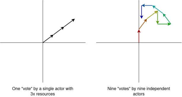より一般的でより深い理由は、ガバナンスシステムが「10万ドルを管理する1人の人物」と「10万ドルを保有する1,000人の人物」に同じ重みを与えるべきではないということです。後者は1,000人の独立した個人を表しており、したがって、少量の情報の重複ではなく、より豊富で価値のある情報を含んでいます。また、1,000人からのシグナルは、異なる個人の意見が互いに打ち消し合う傾向があるため、より「穏やか」になる傾向があります。