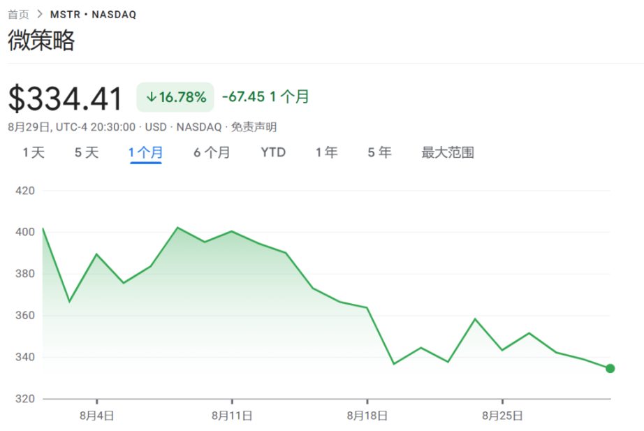 ストラテジーの株価は8月に16.8%下落し、同社が長年ビットコイン保有によって享受してきたプレミアムの大半を失った。