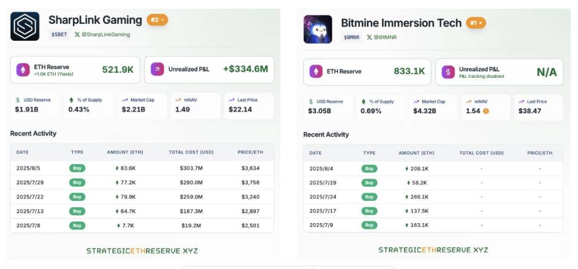 同時に、BitMineとSharpLinkを筆頭とするETH戦略準備会社もETHの大量購入を継続しており、現在、これら2社だけで保有するETHの総量は135万ETHを超えています。