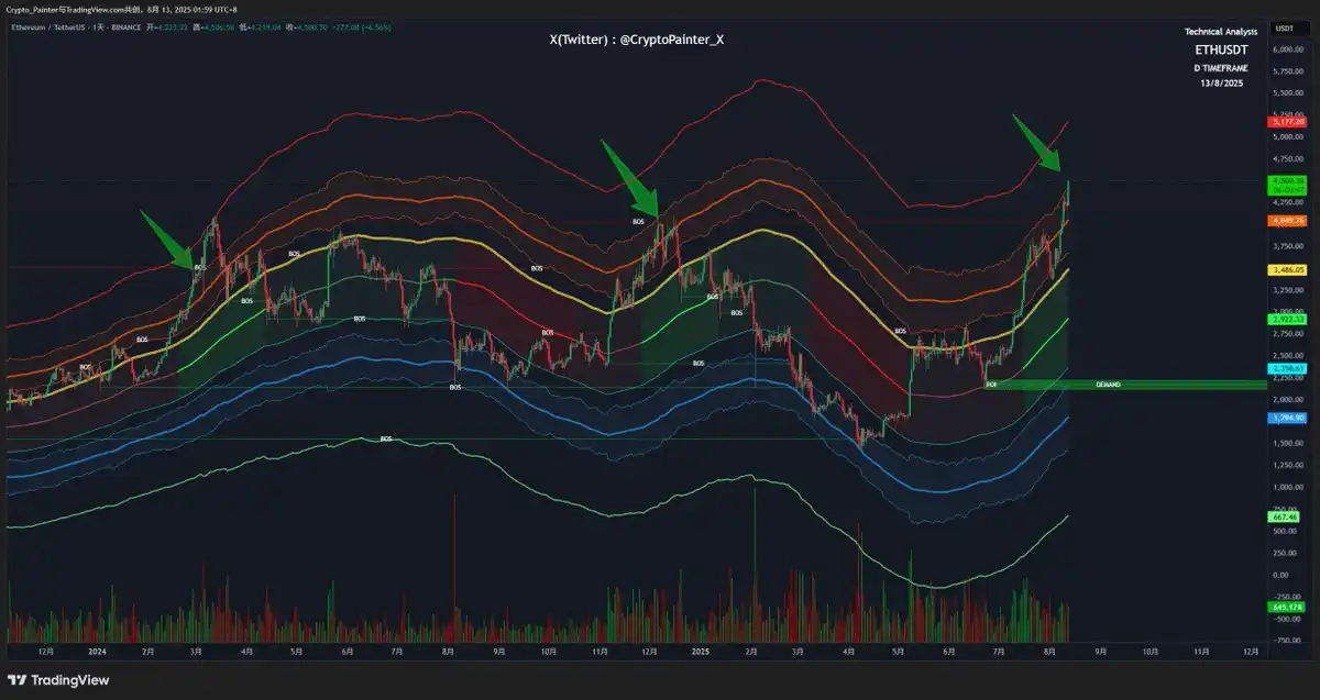 1. 仮想通貨アナリストの@VirtualBacon0x氏は、ETHが新たなマクロ強気相場に入ったと考えています。彼のベースラインシナリオでは、ETHは2025年末までに6,000~7,000ドルに達すると予想され、長期的な目標は2026年半ばまでに約10,000ドルです。非常に楽観的なシナリオでは、市場が本格的に熱狂し、BTCが200,000ドルに達し、ETHがそれをアウトパフォームした場合、Virtual Bacon氏はETHが16,000ドルに達する可能性があると予測しています。