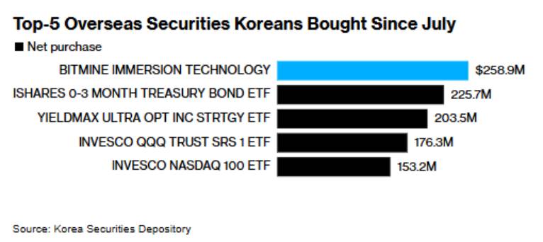 8月15日時点で、BitMineは120万ETH以上(53億ドル相当)を保有しており、これは2位のSharpLinkの保有量の2倍以上です。韓国証券保管振替機構(SKDC)のデータによると、韓国の個人投資家は7月以降、BMNRを2億5900万ドル以上買い越しており、この期間で最も人気の高い外国証券となっています。
