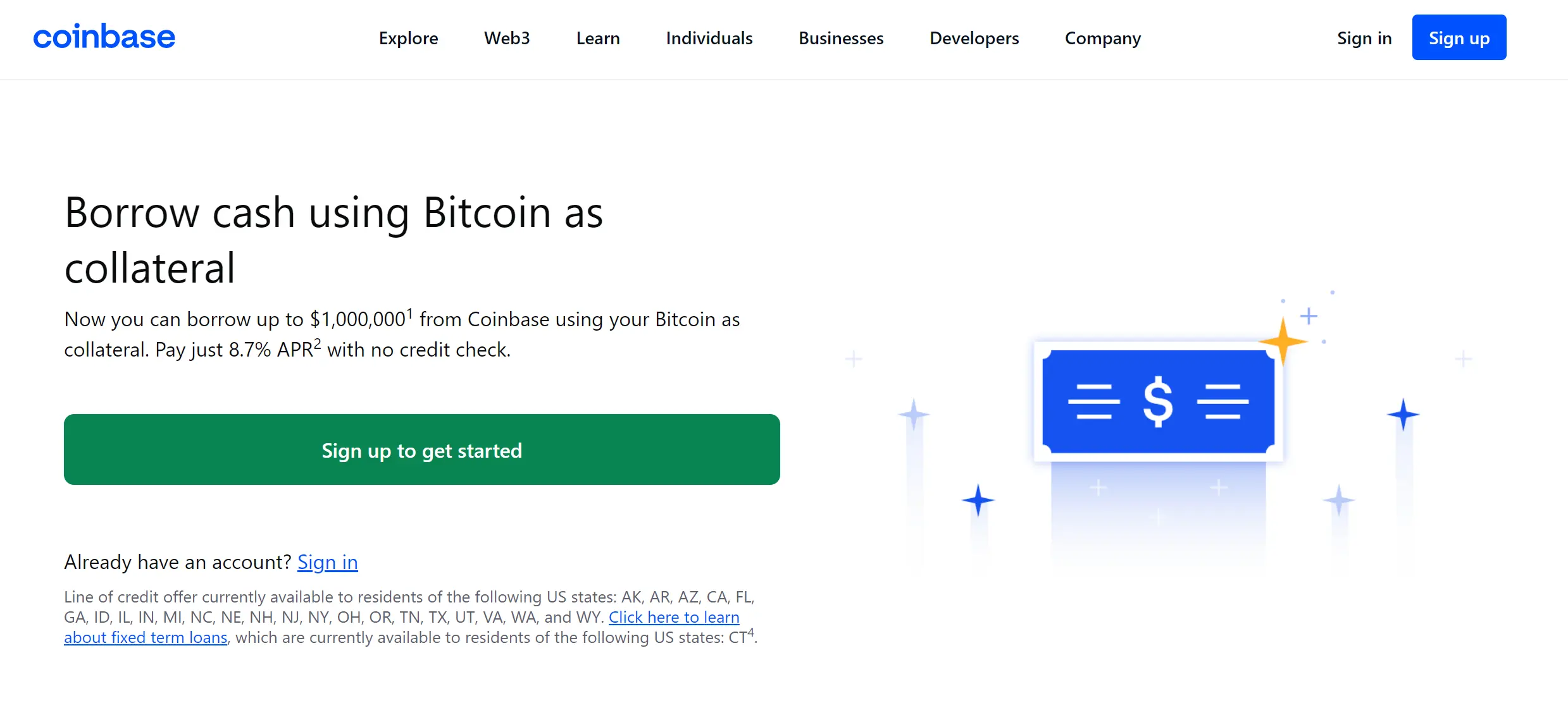 Coinbase Borrowは、ユーザーが保有する暗号通貨を担保として融資を受けることができるサービスです。公式サイトによると、米国の一部の州の顧客は、Coinbase Borrowを利用して、ビットコインを担保に最大100万ドルの融資を受けることができます。ビットコインアカウントの価値の40%まで借りることができ、年利は8.7%だそうです。