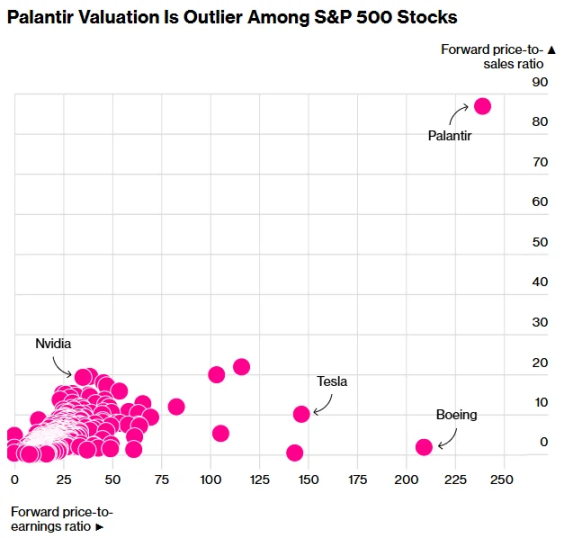 さらに奇妙なのは、その評価額だ。PLTRの予想株価収益率(PER)は驚異の245倍であるのに対し、業界平均はわずか24倍だ。一方、「AIバブル」と称されるNVIDIAのPERはわずか35倍だ。