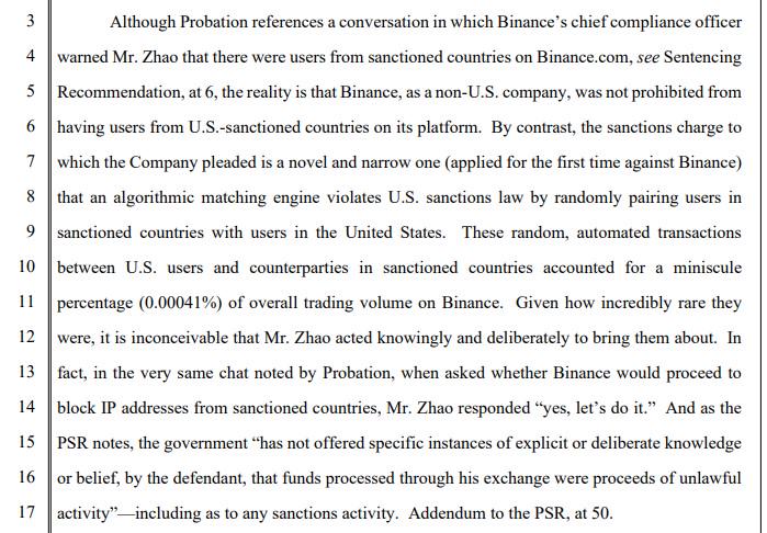 さらに重要なことは、Changpeng Zhaoの法務チームの判決覚書には次のように述べられていることだ。米国の制裁法に違反して、制裁対象国のユーザーと米国のユーザーがランダムに組み合わせられること。米国のユーザーと制裁対象国の取引相手との間で行われるこれらのランダムな自動取引は、Binance の総取引高のほんの一部 (0.00041%) に過ぎません。 ) これを考慮すると、実際、Binance は制裁対象国からの IP アドレスをブロックしていると、Changpeng Zhao 氏を非難するのは無理がある。」